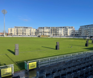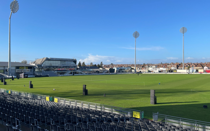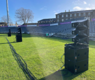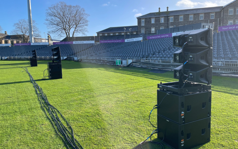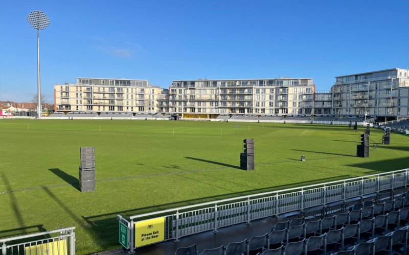 スタジアムはグロスターシャー・カウンティ・クリケットクラブの本拠地で、収容人数は8,000名。勾配の異なる観客席に対応するため、総計16スタックのNEXO GEO Mを地上に展開しました。奥側の席にはGEO M10を3台とMSUB15を2台、手前の席にはGEO M6を3台とMSUB15を1台組み合わせています。また、VIPエリアや遊園地エリアにはP12やID Seriesをサポートとして使用しています。